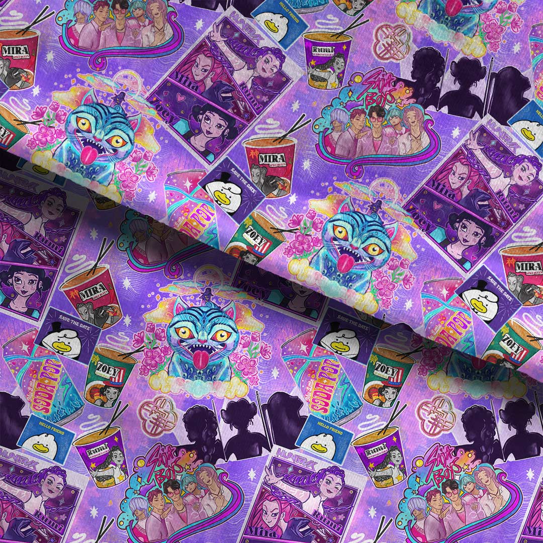 Fabric printed in house with pigment inks on cotton based fabric and sublimation on polyester based fabrics.