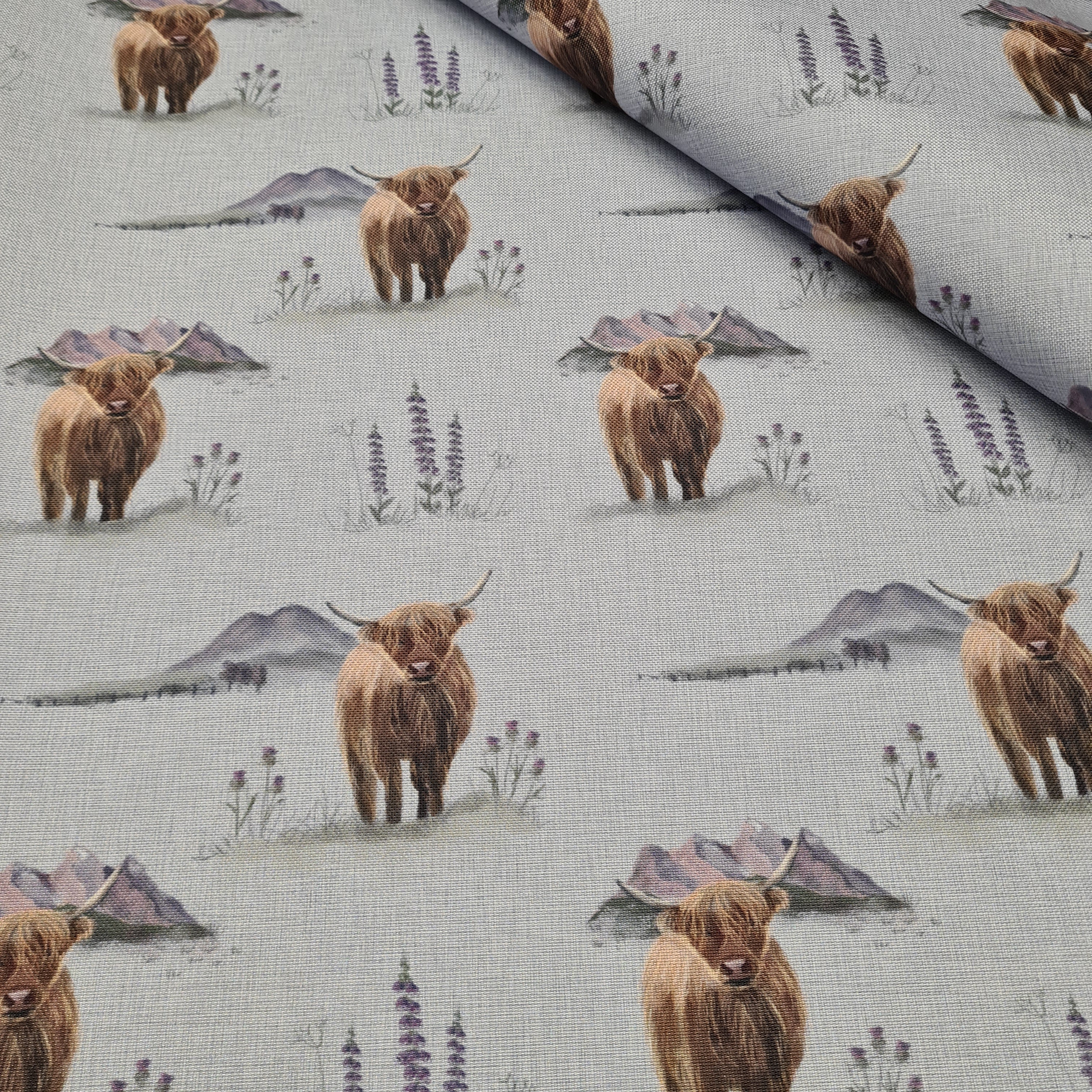 Highland Cow Grey Waterproof Canvas, remnant 1m