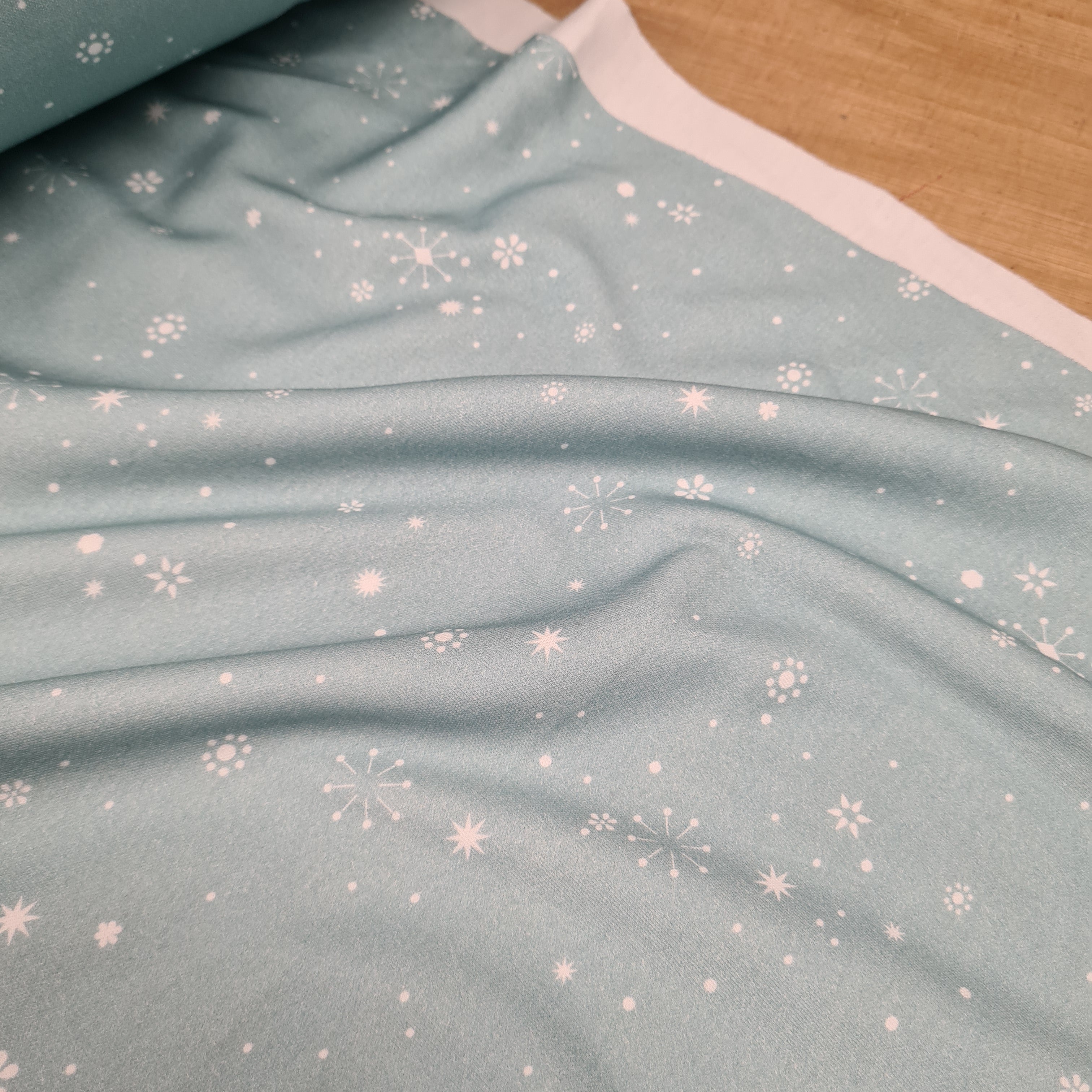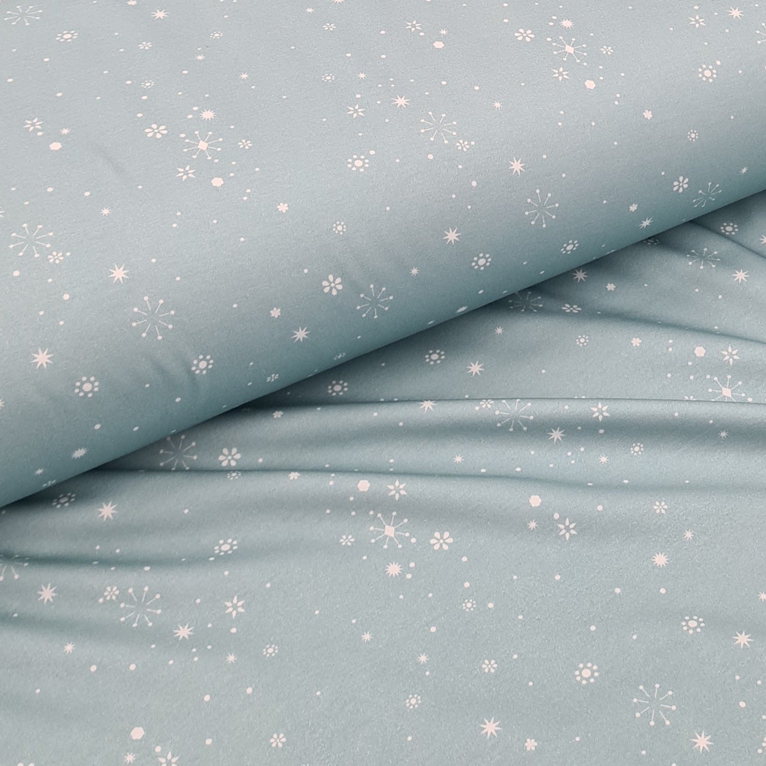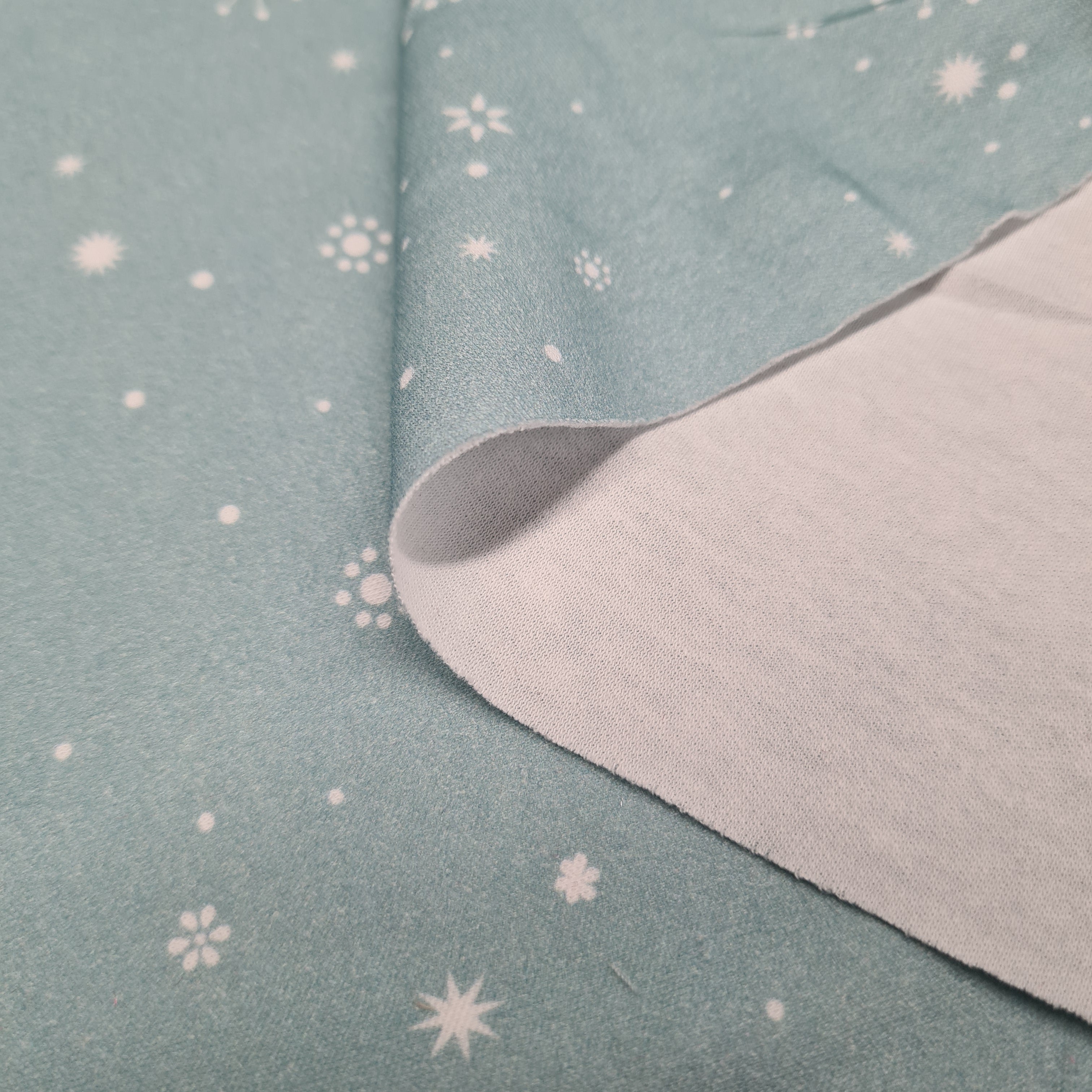 Snowflakes Mint Cotton Interlock Jersey, priced by half metre is backordered and will ship as soon as it is back in stock.